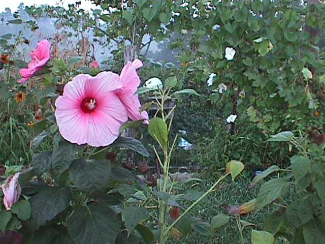 | Hibiscus and herb garden. The fence has gourds and moonflowers. | |||||||||||||||